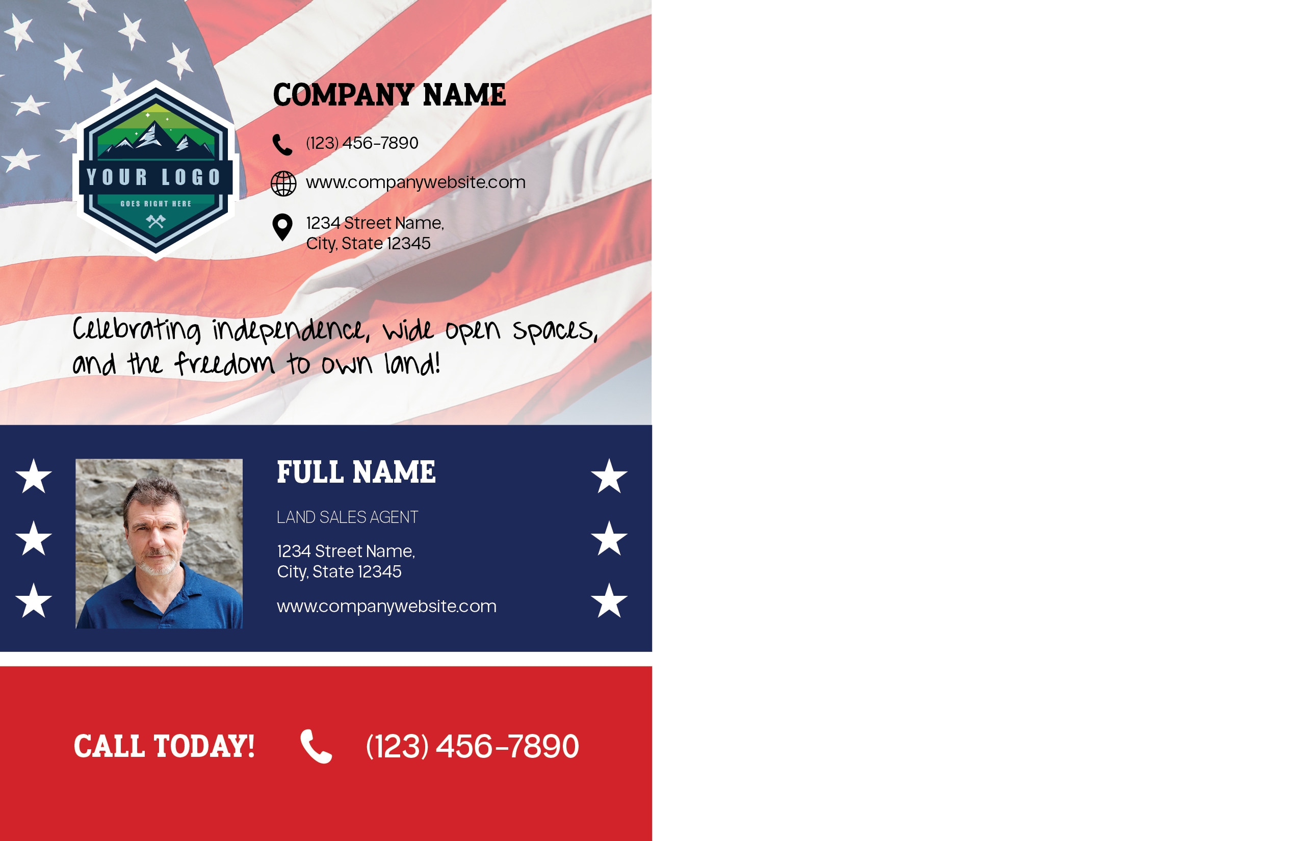 Back Text: “Celebrating independence, wide open spaces, and the freedom to own land!” The text is customizable. Remember: short and sweet!